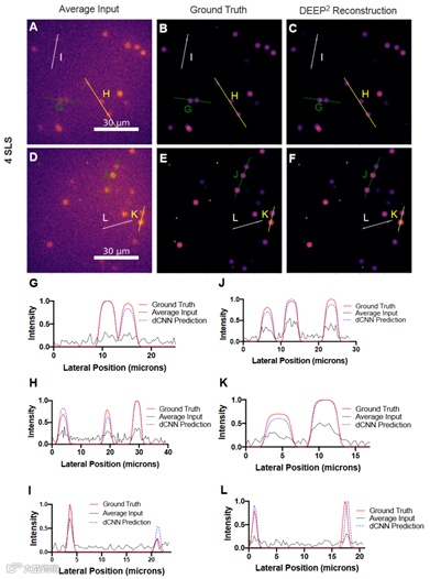 图2 利用DEEP2重建距离表面4个SLS(约200 μm)深度的混合荧光微珠(直径为1 μm和4 μm)图像的结果。(A)、(D)为两个代表性的模拟DEEP-TFM图像堆栈(平均32个模式)。(B)、(E)对应的(A)和(D)实例的合成基准图像。(C)、(F)对应于(A)和(D)实例的DEEP2重建结果。绿色和黄色线条的强度剖面显示在(G)和(H)图中。类似地,线条I和J的强度显示在(I)和(J)图中。