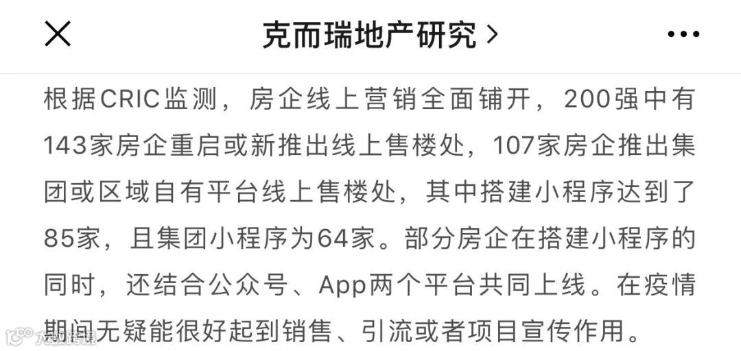 据克而瑞研究中心监测,房企200强中有143家房企重启或新推出线上售楼处,107家房企推出集团或区域自有平台线上售楼处,其中搭建小程序达到了85家,且集团小程序为64家。部分房企在搭建小程序的同时,还结合公众号、App两个平台共同上线。推出了看房小程序、线上购房App,并通过VR全景看房、抢电子优惠券、看房直播等方式,火力全开力推线上看房、订房功能。