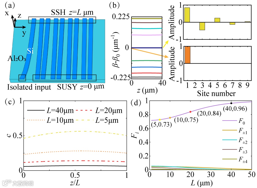 图2. 超对称波导的泵浦原理与绝热性能。(a)一维硅波导阵列示意图,(b)能谱和拓扑零模分布在传播中的演化,(c)绝热参量在传播中的演化,(d)泵浦效率随波导长度变化。