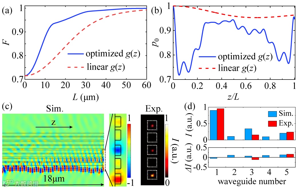 前文中的绝热设计需要缓慢调制以满足绝热条件,从而不可避免地导致较大的器件尺寸(~40 μm)。因此,希望能够在保持泵浦效率不变的同时,使器件更为紧凑。研究人员采取逆向设计的方法,通过打破绝热条件,使得零模能够暂时演化为其他模式,以加速泵浦过程,但最后仍然能回到零能级(图4(b))。通过逆向设计优化,达到相同泵浦效率所需的波导尺寸显著缩短(~18 μm,见图4(a))。逆向设计的输出与光强分布如图4(c,d)所示,可以看出,所得到的拓扑态仍具有较高的保真度。