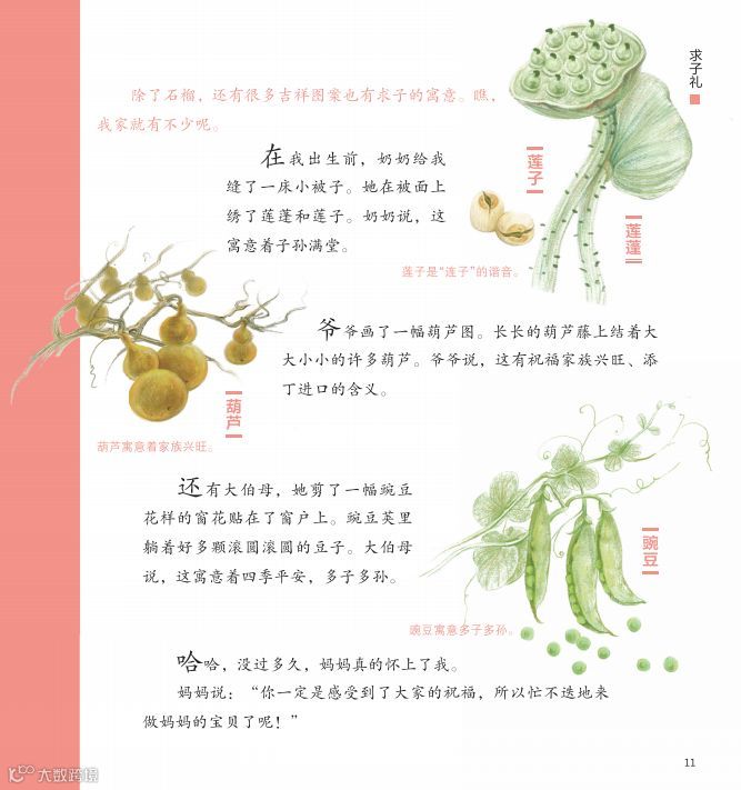 书中还会涉及一些传统的民俗知识点,比如:我是怎么来的-求子;我的名字是怎么取的-取名;为什么要上学-拜师求学。