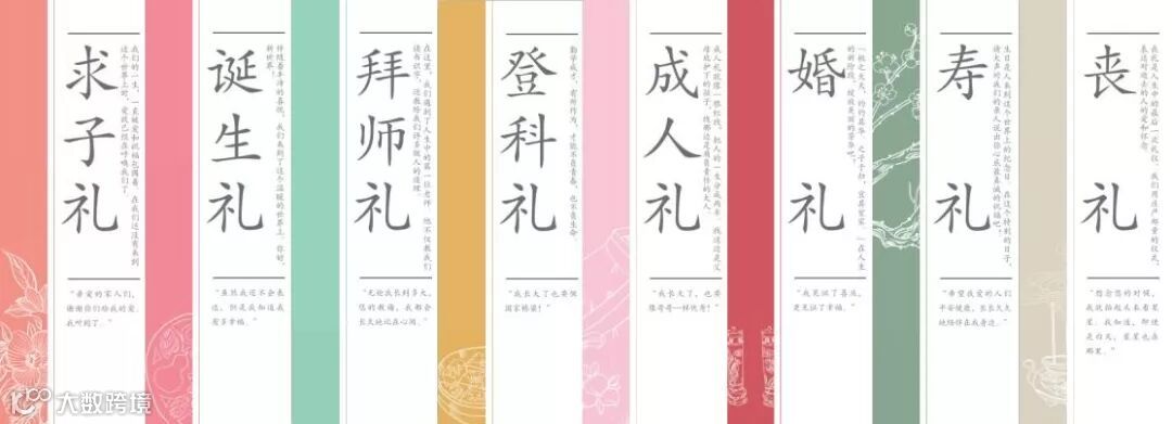 求子礼-感念亲恩、出生礼-珍爱生命、拜师礼-尊敬师长、成人礼-担当责任、登科礼-勤学成才、婚礼-信守承诺、寿礼-孝敬长辈、丧礼-敬畏生命。