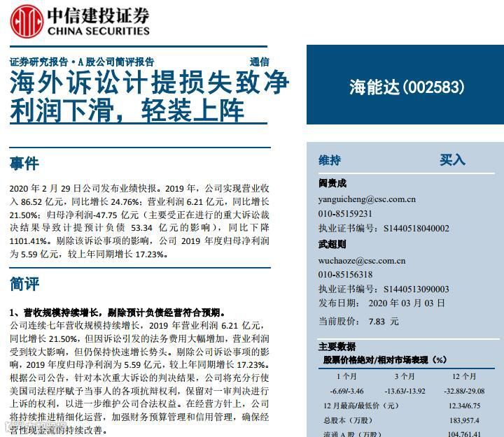 2月28日,海能达发布业绩快报称,受正在进行的重大诉讼裁决结果导致计提预计负债的影响,公司将根据此前陪审团裁决结果作为当前最佳估计数,在2019年度报告中针对该资产负债表日后事项计提预计负债人民币约53.34亿元。2019年归属于上市公司股东的净利润为-47.75亿元。剔除该诉讼事项的影响,公司2019年度利润总额为6.16亿元,较上年同期增长19.07%;归属上市公司股东的净利润为5.59亿元,较上年同期增长17.23%。