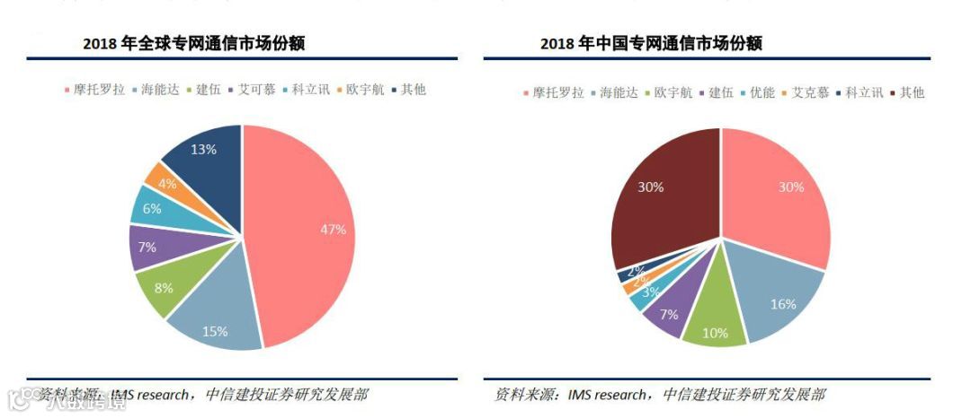 2019年11月,中信建投证券发布的研报显示,2018年,海能达业务规模在专网通信市场全球和国内均排名第二,仅次于摩托罗拉,公司在全球专网通信市场份额为15%,在国内专网通信市场份额为16%。专网通信行业集中度较高,全球前五的供应商合计占市场规模比重达80%以上,其中行业龙头摩托罗拉占全球市场份额的47%。