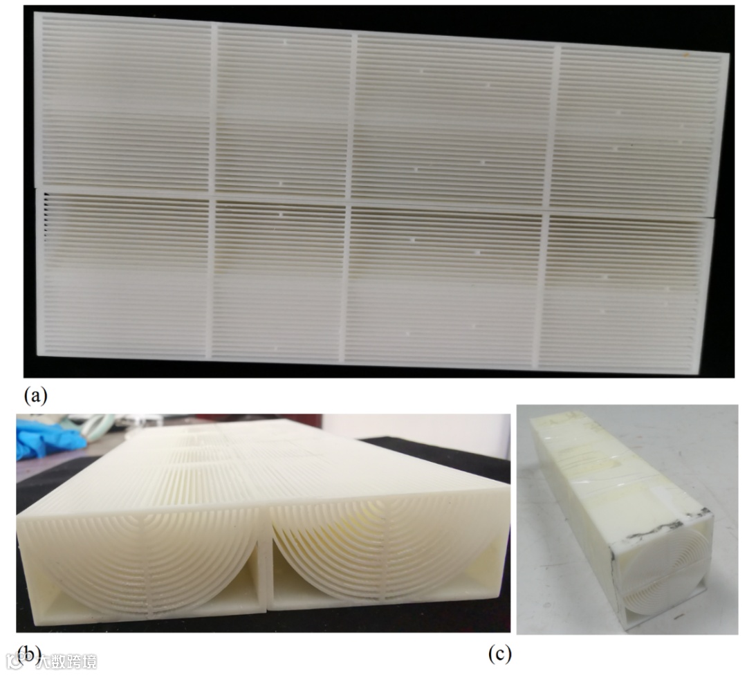 由于结构变形过大且不规则,无法保证声学性能的可重复性和制造的一致性。为此,为了提高加工精度,需要改进样品加工工艺。在尝试了大量现有的3D打印解决方案和设备后,表明对于这种具有超薄大尺寸壁面的结构,很难制备出变形较小的高精度样品。为此,我们尝试选择特殊材料并开发新的制备工艺来提高加工精度。在材料方面,使用了一种名为Somos®PerFORM的新型含陶瓷光敏材料。这种材料中的陶瓷比例高达40%或更高,可以大大提高耐高温和抗热应力性能,减少热应力和变形。除了优异的耐高温性(可承受超过260°C的高温)外,其强度远高于一般树脂,具有优异的承载能力。此外,为了获得更好的耐温特性,引入了持续4小时以上的预热-保温-冷却循环热处理来增强样品。这种特殊的热处理将促进材料的分子结构充分进行网络交联(一般光敏树脂材料的分子大多以链的形式结合),并使内部无机组分在分子水平上更加稳定,从而使制造的结构具有更好的力学性能。此外,在两部分之间的接合面上增加了三个加强筋,以进一步减小结构变形。通过这种集成的材料工艺结构优化设计,成功制备了变形最小的高精度样品,如图6a和6b所示。显然,实际结构与设计模型一致,没有明显变形。结构的两个部分通过双面胶带粘合,组装得到测量样品,如图6c所示。从图7a所示声入射侧的照片可以看出,样品的两个部分可以很好地结合在一起,没有明显的间隙。
