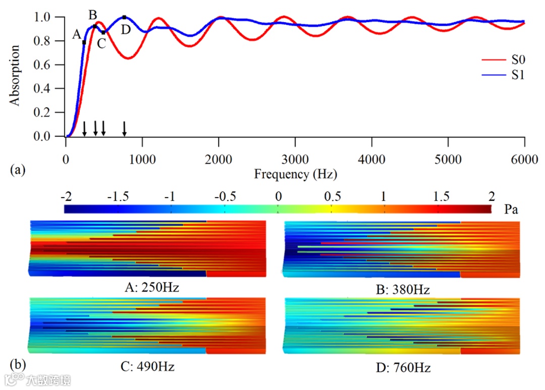 与S0相比,有效下限吸声频率(定义为吸声系数首次达到0.8的频率)从大约320Hz降低到大约220Hz,提高了低频吸声性能。在整个频带中,吸声系数波动显著减小,而最低值也达到0.74,大大提高了宽带吸声性能。特别是在800Hz以上的中频和高频范围内,吸声系数几乎没有波动,并保持恒定在约0.95。以往的很多工作中主要通过添加多孔材料吸声层来消除吸声曲线的波动。然而,本文设计的吸声结构属于高孔隙率结构,不需要引入额外的组件。