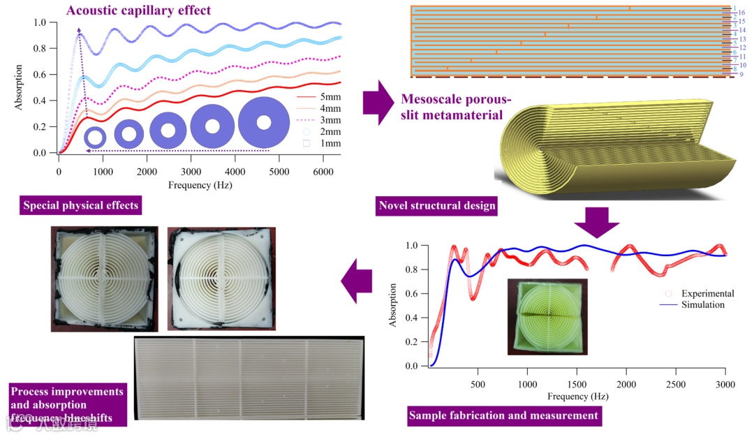 由于传统吸声材料或结构只有达到一定厚度时,才能有效吸收低频声波,在很多应用中无法满足尺寸限制和轻量化要求。超结构的发展为具有亚波长厚度的低频吸声结构设计提供了新的可能,激发了吸声结构研究的热潮。与传统材料和结构相比,超结构的最大特点是可设计性强,物理性能往往比传统结构更加优异,且尺寸是亚波长的。这些优点使得其可以很好的克服传统吸声材料和结构的不足,在各类工程领域具有重要的应用价值。吸声超结构类型很多,常用的有Helmholtz共振腔结构、共振薄膜/薄板结构、F-P共振结构、迷宫结构、狭缝结构等,以及基于这些结构的组合或派生结构。其中,狭缝吸声结构通过狭缝内的空气与壁面之间的摩擦耗能,实现吸声效果,原理和多孔材料相似。大量研究表明,通过减小结构与声传播媒介之间的阻抗失配程度,即实现阻抗匹配,或降低声传播速度,均可以提高吸声结构的吸声性能。事实上,要实现宽带的阻抗匹配,主要还需要依赖于微观尺度的多孔结构。然而,附加多孔吸声材料的方案的适用范围会受到多孔材料本身的缺点限制,包括无法满足环保要求,与超材料吸声结构无法紧密稳定的结合,以及无法承受力学载荷等。