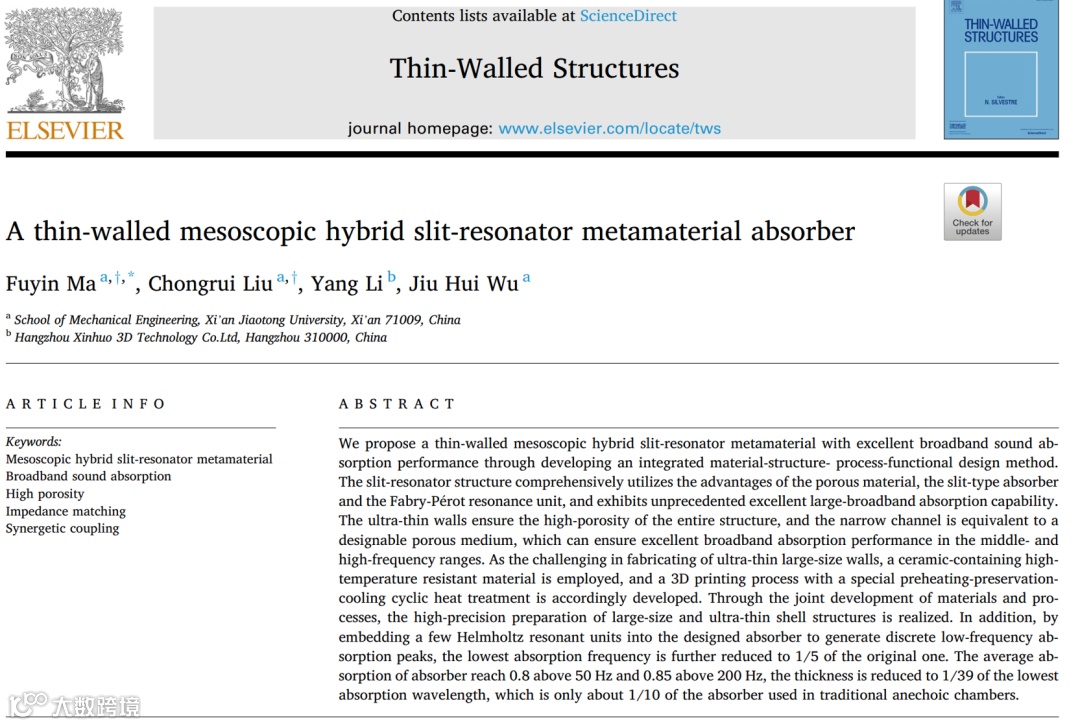 相关研究成果以“介观尺度狭缝-共振复合薄壁吸声超结构”(A thin-walled mesoscopic hybrid slit-resonator metamaterial absorber)为题,在线发表在《Thin-Walled Structures》[Thin-Walled Structures, 193, 111226, 2023]上。西安交通大学为第一作者单位和唯一通讯单位,马富银教授和刘崇锐助理教授为共同第一作者,马富银教授为共同通讯作者。