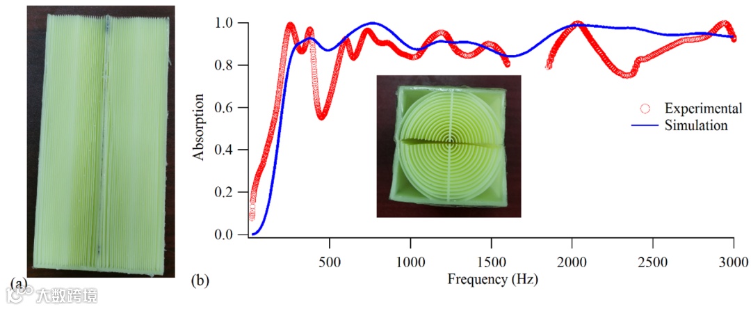 图5 (a)采用普通光敏树脂材料和传统3D打印工艺加工的吸声超结构样品组件;(b)测量和有限元仿真计算得到的吸声系数对比,插图显示了样品声入射侧的照片。