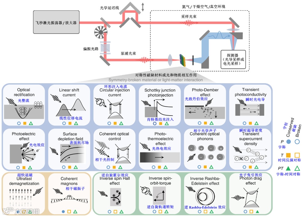 简单来说,产生太赫兹发射需要材料在空间和/或时间中具有一定的方向性。因此,如果太赫兹辐射能够被产生,就能够得到所研究的材料系统中关于对称性的信息。通过测量太赫兹发射信号对于入射光偏振、频率和幅值等参数的依赖性,能够详细地得到材料中的结构、电学和磁学等性质,以及其中的光和物质相互作用。