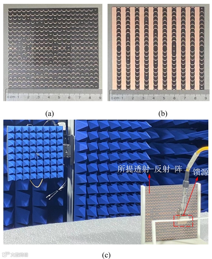 图3透射三波束反射双波束透射-反射-超表面天线:(a)实物图的俯视图(b)实物图的仰视图(c)天线暗室中的测量过程图。