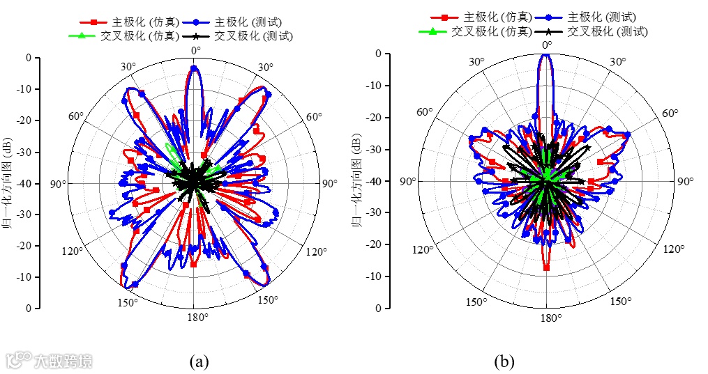 图4透射三波束反射双波束的透射-反射-超表面天线仿真和测试方向图:(a)xoz平面(b)yoz平面。
