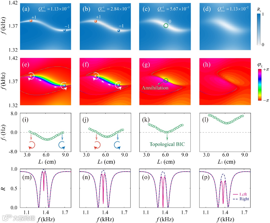 研究团队从声学谐振子-法布里珀罗(FP)腔系统出发,当一个亥姆霍兹谐振器(HR)位于FP腔的波节处时,系统支持平凡束缚态(Bound State in the Continuum, BIC)模式,接着再额外引入一个声学谐振腔,进一步分析平凡BIC模式与另一共振模式的相互作用,以及此类非厄米系统的奇异散射特性。具体来说,研究团队主要是在工作频率和HR的位置组成的二维参数空间(f-L1)中去分析拓扑相位奇点的演化和拓扑BIC的形成。调节损耗因子,散射矩阵的零点色散关系会沿着纵轴方向上下移动,当其与复频率面的实轴相交时,会产生拓扑相位奇点。当损耗因子增大到特定值时,异号拓扑电荷会逐渐靠近,直到湮灭,此时恰好形成拓扑BIC。此时再继续增大损耗因子,拓扑相位奇点和零反射现象均消失。总的来说,正是拓扑BIC诱导了非厄米系统在特定条件下的零反射现象。此外,研究人员进一步在频率参数空间中去分析散射矩阵本征值的演化,并发现在散射奇异点(Exceptional Point, EP)系统呈现极端非对称吸收现象。