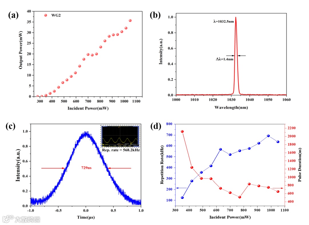 随后研究人员在制备的波导的两端搭建腔镜,实现连续波导激光输出。同时研究人员使用三元过渡金属硫化物ReS0.8Se1.2作为可饱和吸收体来实现调Q脉冲波导激光输出,其ReS0.8Se1.2-PVA薄膜的制备流程如图3所示。其调Q波导激光的结果如图4所示,输出的调Q脉冲具有125~692.5kHz的可调重复频率,最短脉冲持续时间为513 ns。