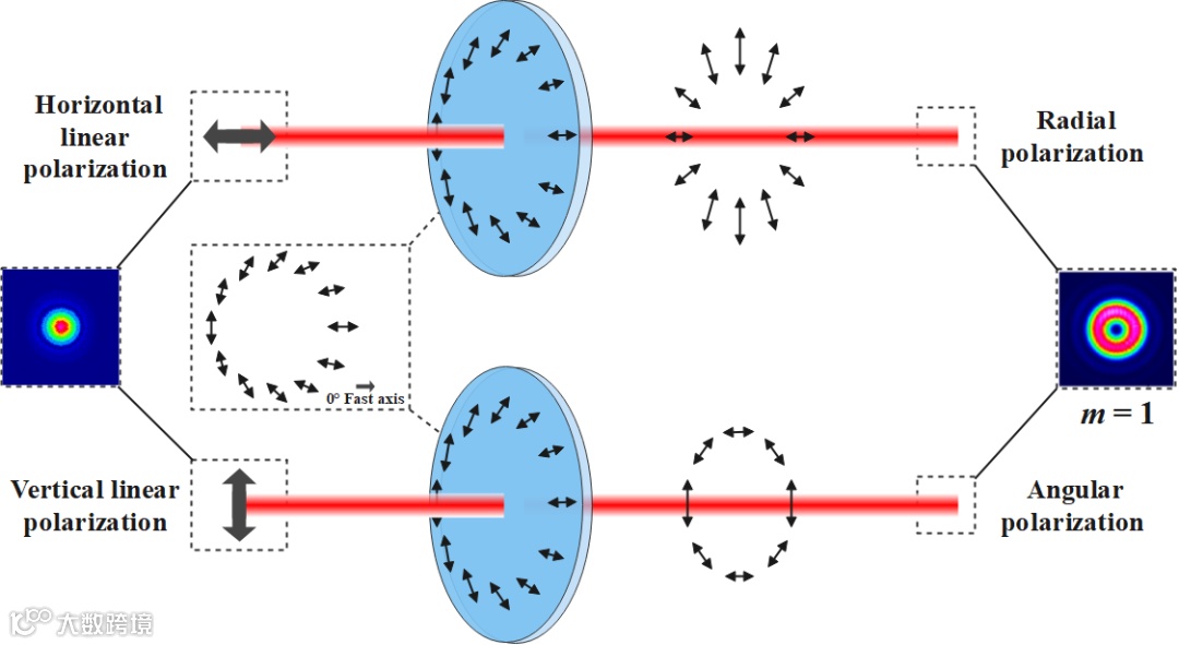 为解决上述问题,研究人员采用自主设计的重频为MHz的飞秒径向偏振涡旋激光直写系统在Yb: CaF2内部制备圆形包层波导,其加工系统图如图1(a)所示,采用涡旋波片来获得飞秒径向偏振涡旋激光,涡旋波片为是与入射光的偏振状态有关的偏振元件和单波长器件。当入射光束为线偏振时,涡旋波片可以产生偏振涡旋光束。有两种例外情况:如果入射偏振光束的偏振方向平行于涡旋波片的0°快轴,且输出光束为径向偏振,即光束截面各点的偏振方向平行于径向;如果入射偏振光的偏振方向垂直于VR的0°快轴,输出光束为角偏振,即光束截面各点的偏振方向垂直于径向,m阶是拓扑电荷。m值越小,出射光束的中心孔尺寸越小。其示意图如图2所示。