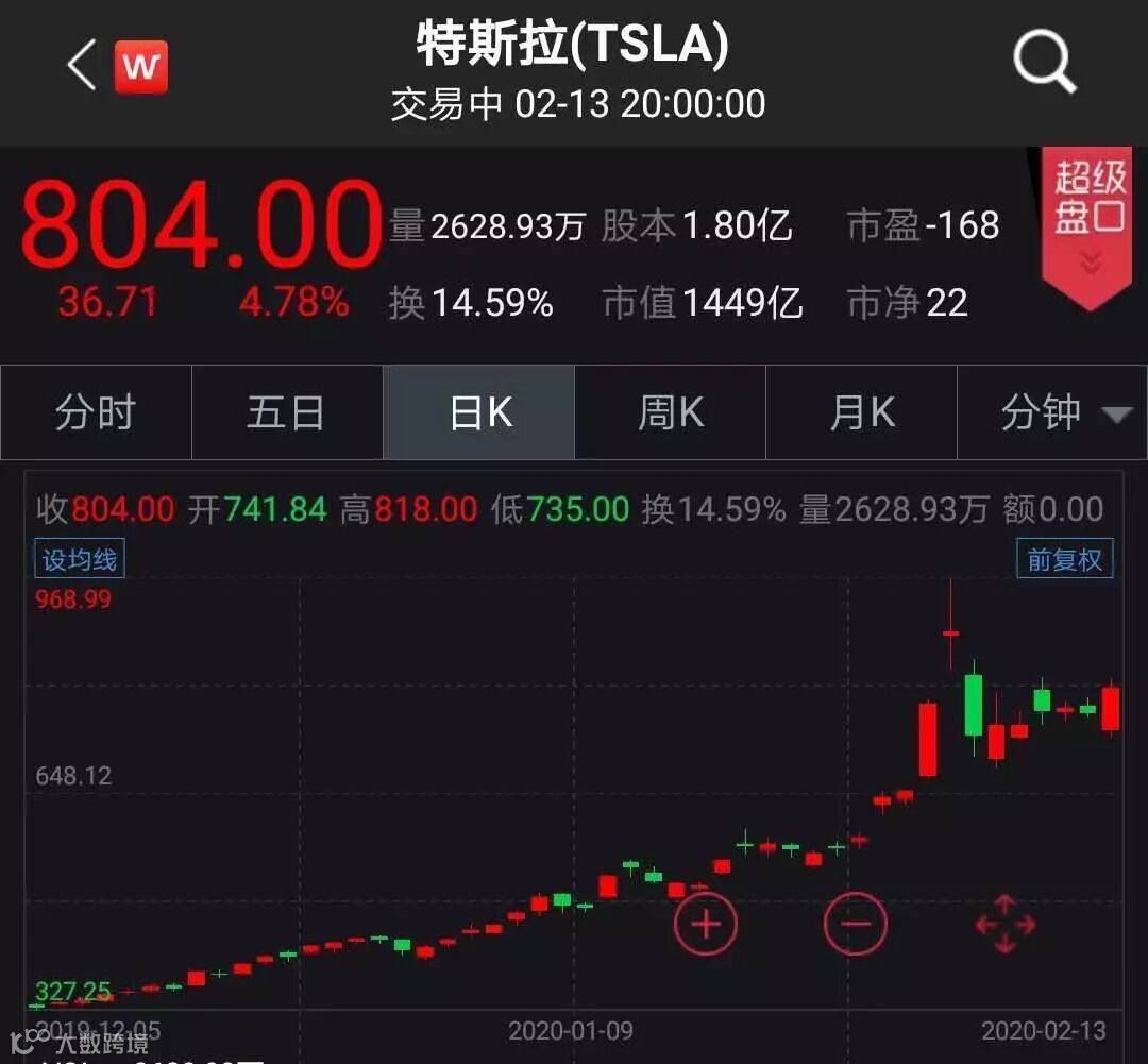 截至美股周四收盘,特斯拉股价低开高走上涨4.78%至804美元,总市值约1449.17亿美元。