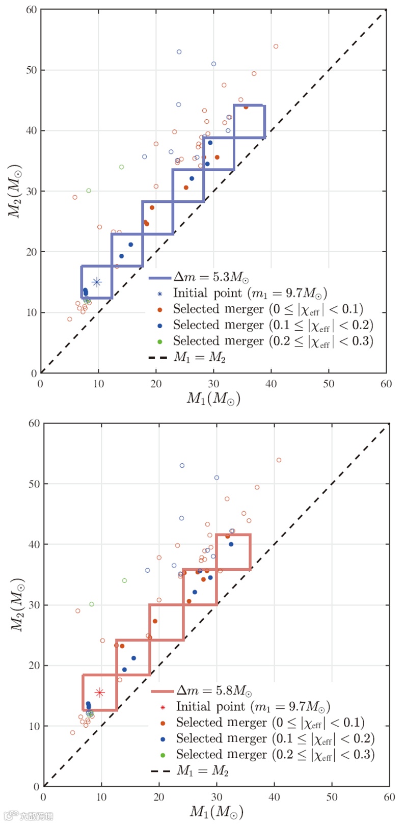 图1: 将引⼒波瞬态目录GWTC-1至GWTC-3公布的引力波数据投影至M1-M2质量平面,依据不同的网格大小进行了两种网格划分。从图中可以看出,蓝色的网格中包含的事件数量变化不大,而橙色的网格线划分中,在20-30倍太阳质量的相邻网格所包含的事件数有大约一个数量级的差异。因此,蓝色的网格给出较为平缓的原初黑洞质量函数,而在橙色的网格划分中,质量函数的起伏较大。