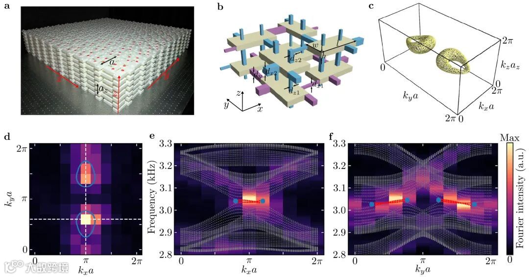 图3 鼓面表面态的实验观测。(a)实验样品图。(b)声子晶体元胞示意图。(c)数值计算的声子晶体的等频面,展现出一对节线。(d)到(f)实验测量得到的声子晶体表面色散,显示在体节线在表面的投影内具有表面态。