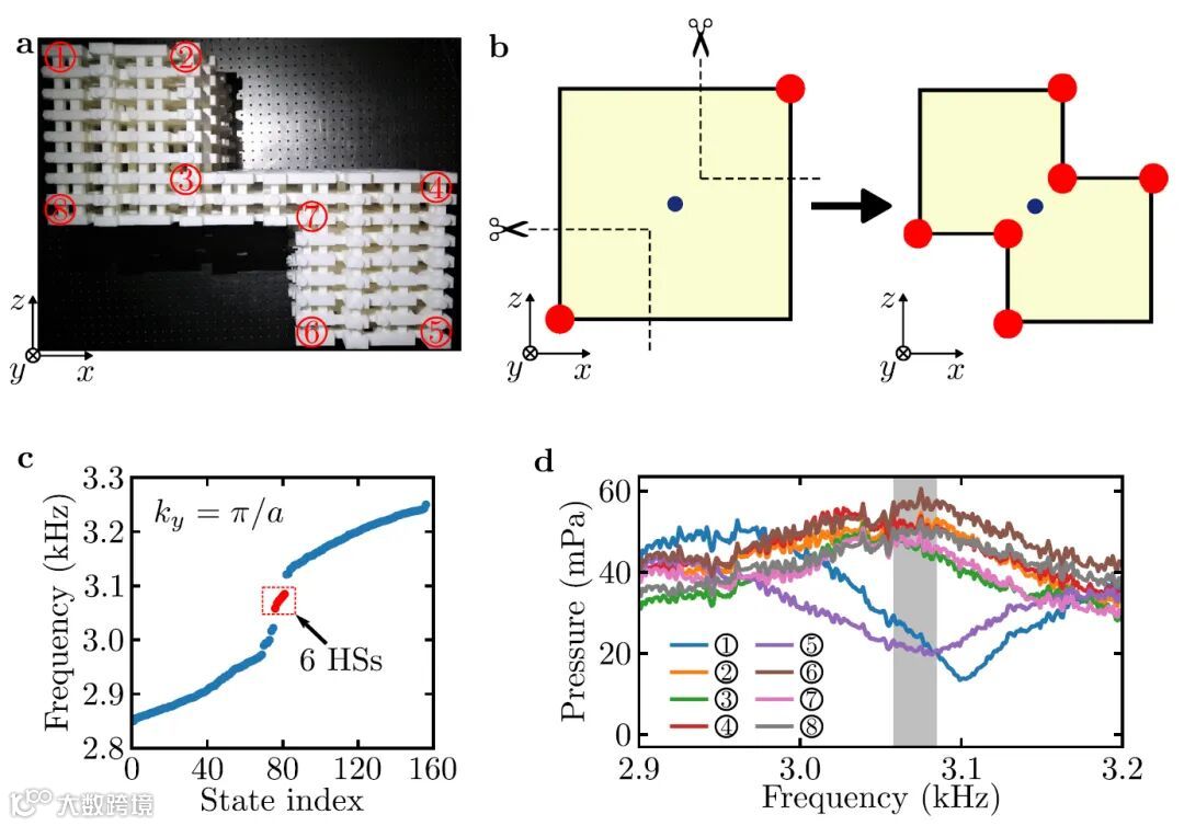 图5 非规则样品中的铰链态。(a)实验样品图。(b)样品构建示意图。可将图4中的规则样品的两个角裁剪掉得到该不规则样品,铰链态的数量也将从一对变为三对。(c)数值计算得到的本征值,显示有六个铰链态。(d)实验测量得到的所有铰链上的频谱,显示在仿真预测的六条铰链上有铰链态。