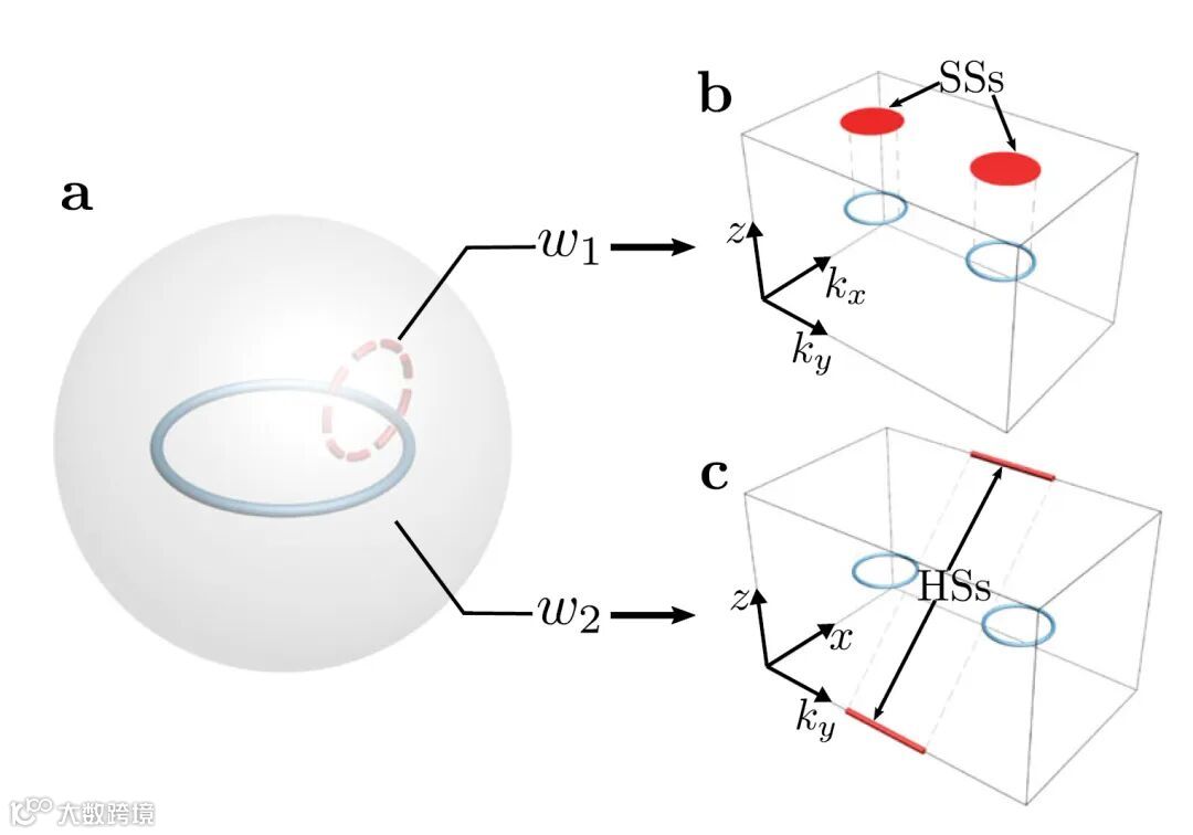 图1 具有双重Stiefel-Whitney拓扑数的nodal line。(a)两个拓扑数可分别通过红色虚线与灰色球面来定义。(b)第一类Stiefel-Whitney拓扑数引起二维边界上的表面态。(c)第二类Stiefel-Whitney拓扑数引起一维边界上的表面态。