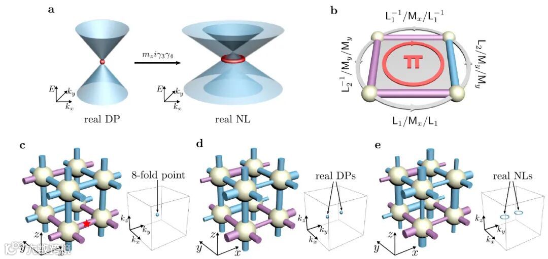 图2 晶格模型设计流程。(a)一个四重简并的狄拉克点可通过适当扰动转变为具有双重Stiefel-Whitney拓扑数的节线。(b)单个单元中投射对称性示意图。(c)到(e)通过一系列耦合二聚化过程将一个八重简并点转化为两个具有双重Stiefel-Whitney拓扑数的节线。