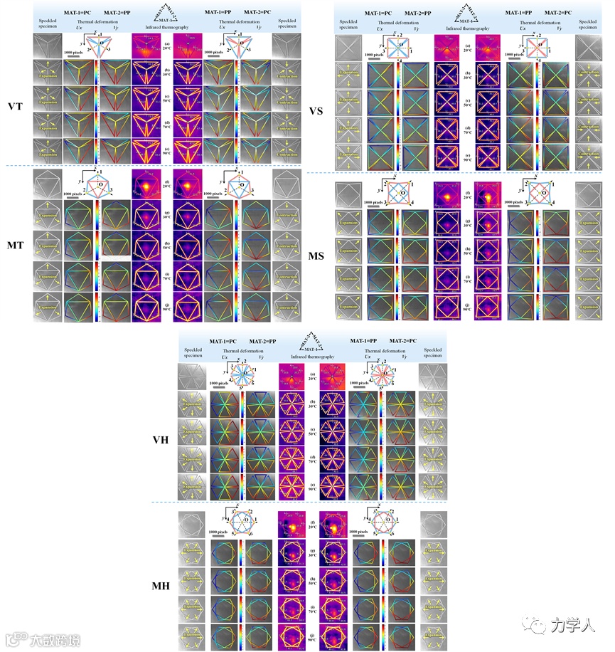 图3 热膨胀系数测试中六类超材料的代表性散斑图、红外热成像和热变形云图