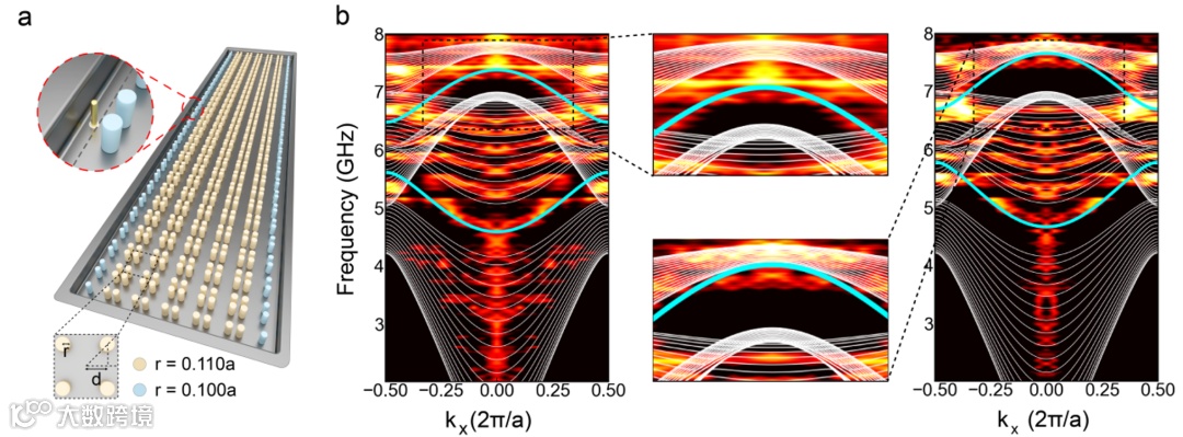图2. 具有方向带隙拓扑绝缘体的投影能带。a 有限尺寸大小的光子晶体示意图,其中体区域与边缘区域的介质柱半径分别为0.110a与0.100a。放大插图显示了探头的位置。b 非扰动晶格的投影能带,其中白线与蓝线分别代表了数值模拟中的体态与边界态,明亮的颜色代表实验测量的投影能带。c 扰动晶格所对应的投影能带。