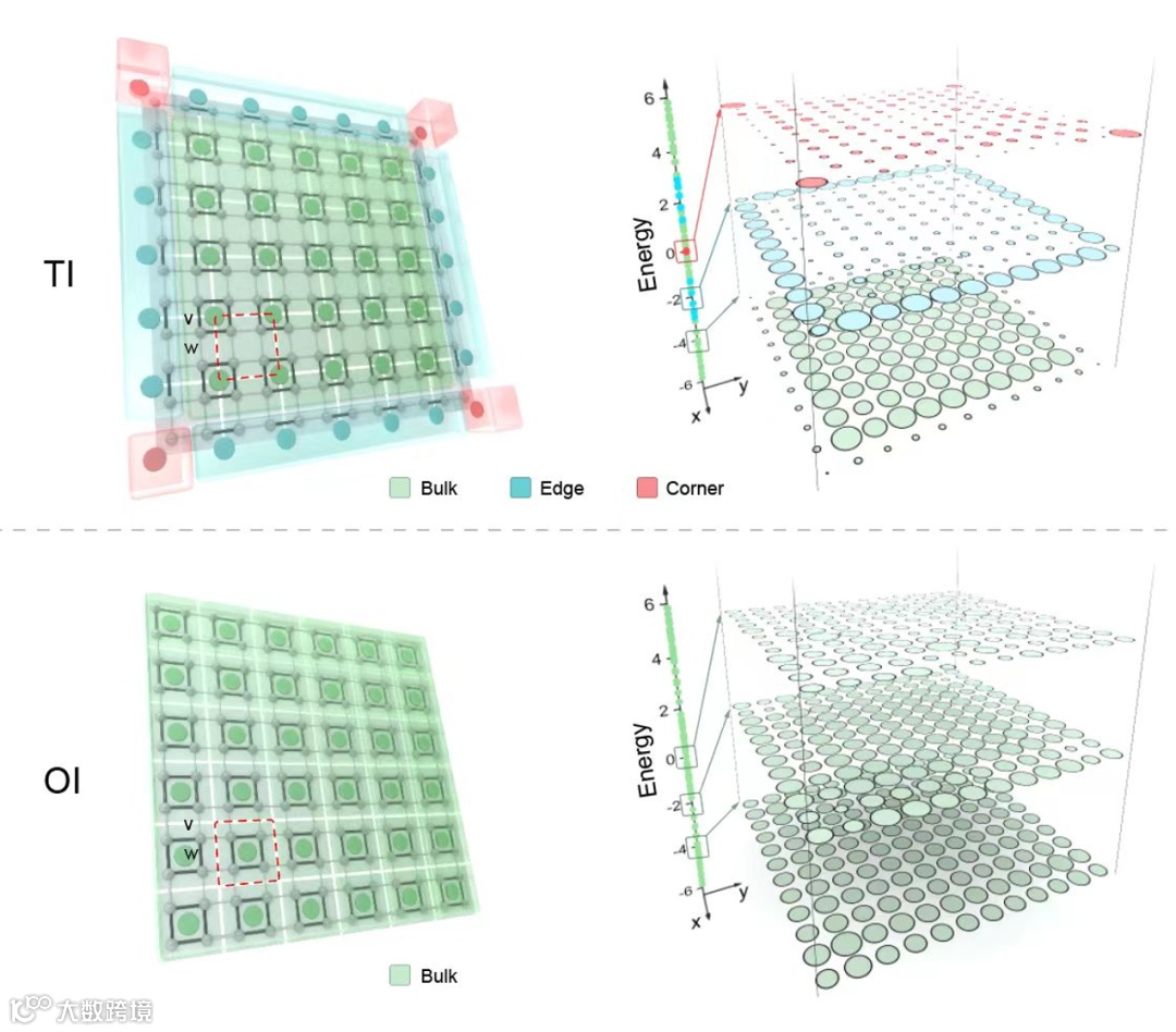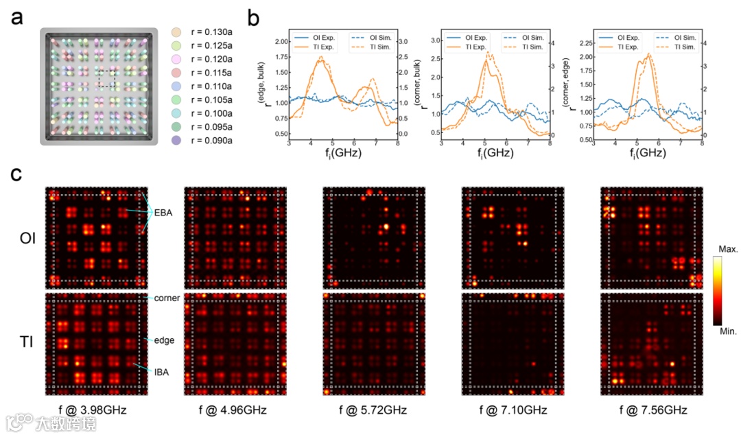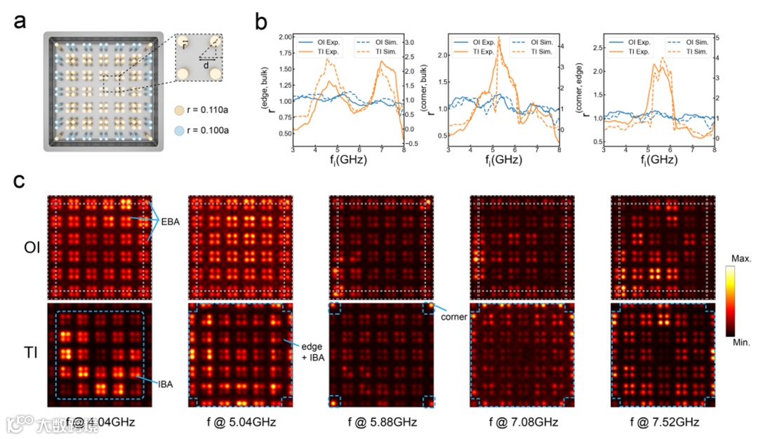 内边界、角以及体区域平均局域态密度的比值r。研究团队发现在拓扑平庸绝缘体中(OI),随着频率的增加局域态密度在整个区域的分布没有多维度分离,然而对于TI来说,随着频率的增加,局域态密度的分布分别主要位于体区域中(回避边界与角的区域,4.04GHz)、边界与体区域中(回避了角区域,5.04GHz)、角与体区域中(回避了边界区域,5.88GHz)、边界与体区域中(回避了角区域,7.08与7.52GHz)(图3)。这一点从比值r中也可以清晰的看出来。