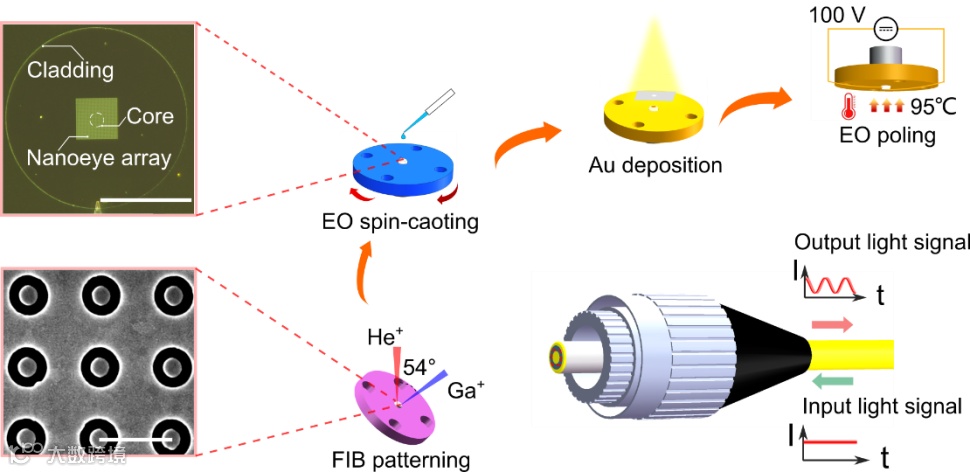 使用标准微纳加工工艺在光纤端面集成电光调制器的加工流程图。左上方的插图是光纤端面旋涂电光聚合物之后的光学显微图像,左下方的插图是利用聚焦离子束刻蚀在光纤端面加工的等离激元超表面,比例尺分别为