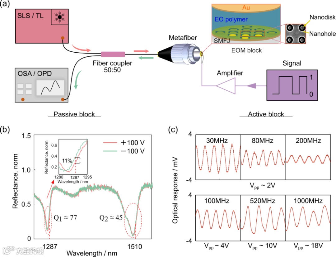 进而,研究者们针对等离激元超构光纤的调制特性做了系统表征,如图3所示。测试结果表明,当施加±100 V直流偏压时,器件呈现出3 nm的光谱偏移和11 %的调制深度,并且当V