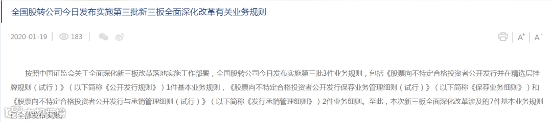 全国股转公司1月19日发布实施第三批新三板全面深化改革有关业务规则,包括《股票向不特定合格投资者公开发行并在精选层挂牌规则(试行)》(以下简称《公开发行规则》)、《股票向不特定合格投资者公开发行保荐业务管理细则(试行)》(以下简称《保荐业务细则》)和《股票向不特定合格投资者公开发行与承销管理细则(试行)》(以下简称《发行承销管理细则》)。至此,新三板全面深化改革涉及的7件基本业务规则全部发布实施。