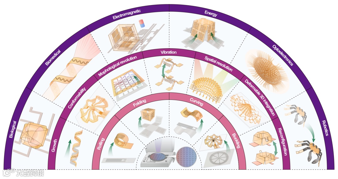图1.三维柔性电子器件的力学引导组装方法。内圈为四种三维组装方法:弯曲组装、折叠组装、共形组装和屈曲组装;中圈为器件的结构性功能;外圈为三维柔性电子器件在生物/医疗、电磁、能源、光电、机器人等领域的应用