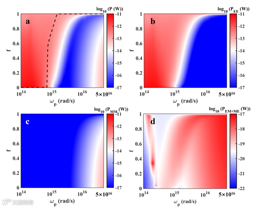 图2. 辐射热流随核体积分数和等离子体频率的变化情况。