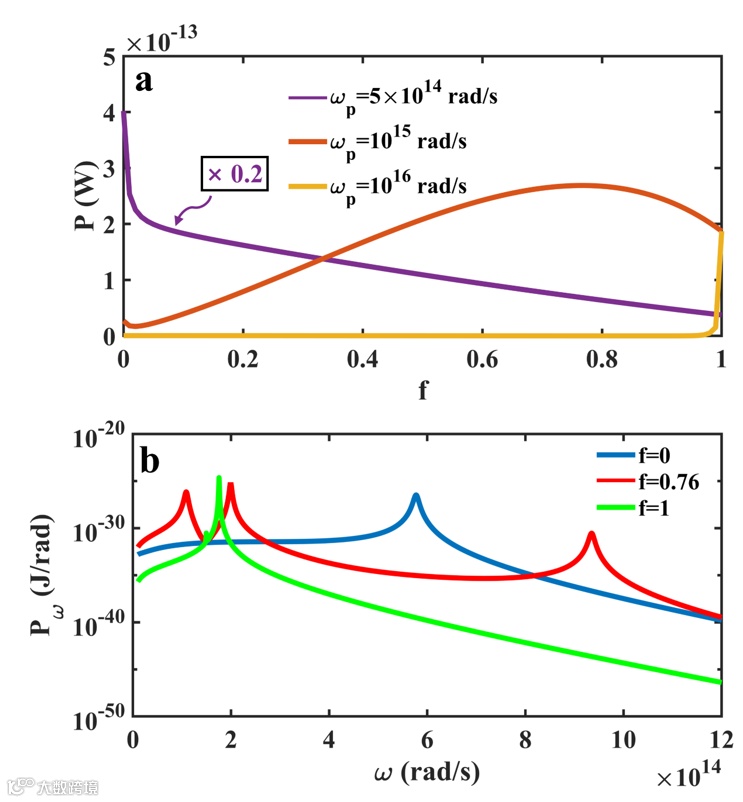 图3. (a)不同等离子体频率下,辐射热流随核体积分数的变化情况。(b)不同核体积分数下,谱热流的变化情况,ωp = 1015 rad/s。