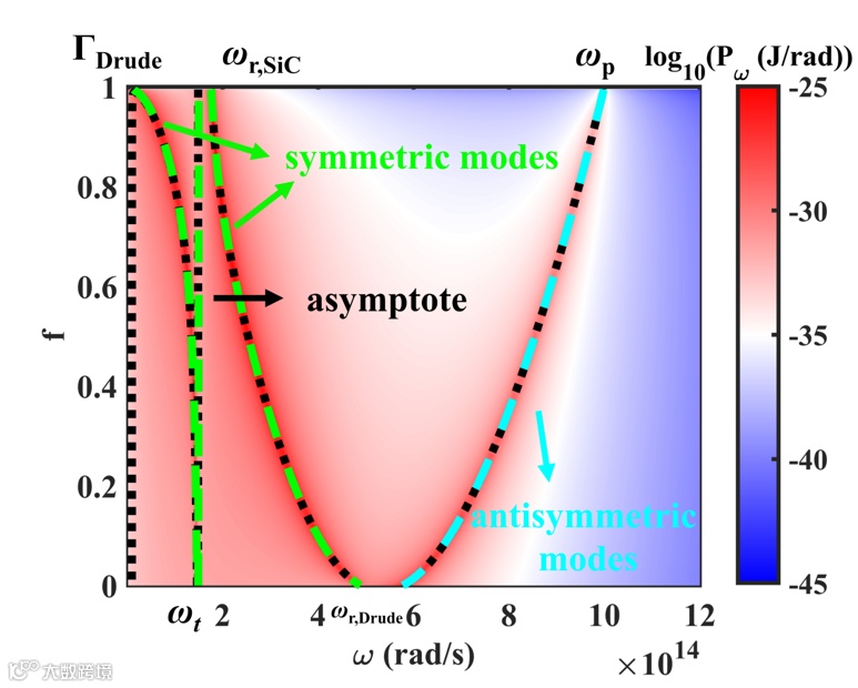 当用Drude壳包裹SiC核时,壳-核以及壳-空气的表面模式会产生杂化现象,其中低频率处的对称模式与高频率处的反对称模式显著增强了辐射换热。