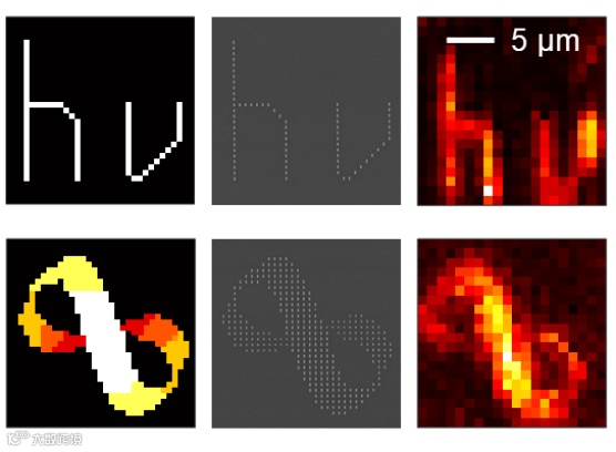 图3:希腊字母 hν 和莫比乌斯环的二维拉曼成像。(左)设计的预期图案,(中)通过光刻制备的纳米颗粒的扫描电镜图,(右)通过微探针扫描得到的拉曼成像图。