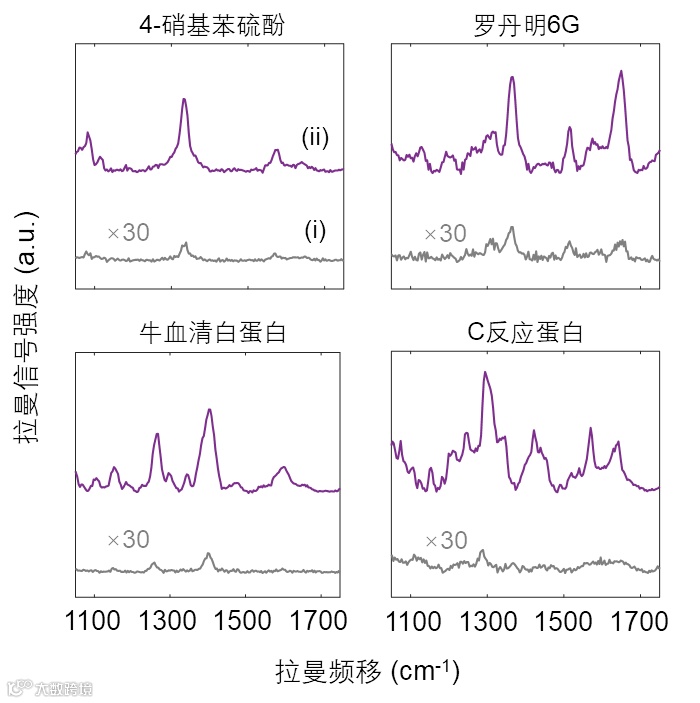 图2:微探针可增强各类化学或生物分子的拉曼光谱信号。通过回音廊微探针(ii)获得的信号比使用传统纳米等离子体测试纸(i)获得的信号增强约 100 倍。
