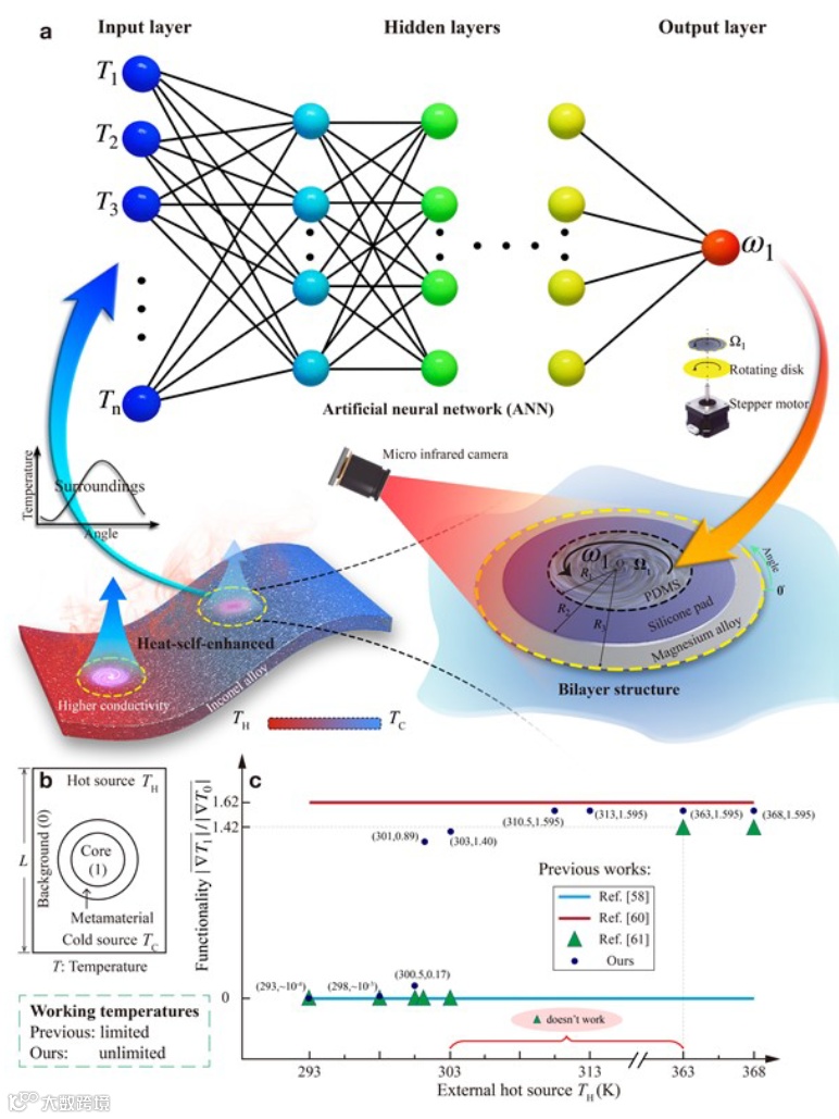 热管理在现代技术中发挥着至关重要的作用,因为有效的热控制可以显着提高电子设备的性能和寿命,降低能耗,并确保用户的舒适和安全。近年来,基于超材料的突破性创新出现在热管理领域,但传统超材料主要关注静态情况,缺乏对可变情况的可调性,为了解决这个问题,提出了具有动态特性的自适应超材料。但最先进的自适应热扩散超材料仍然面临三个长期存在的强大障碍,首先具有鲁棒功能的自适应器件通常需要极其各向异性的参数,其次,现有的自适应器件仅限于与形状记忆合金的相变温度相关的特定温度范围。最后,大多数自适应超材料需要手动调整而不是自动调整。