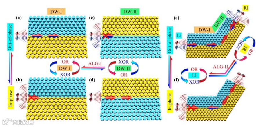 最近,江苏大学孙宏祥教授,袁寿其教授,新加坡南洋理工大学Haoran Xue和张柏乐教授团队证明了具有两个不同畴壁的能谷ATIs中的谷边界态的反对称和对称分布性质可以用于设计可调谐的鲁棒声学逻辑门(ALGs)。研究人员利用声子晶体构成的声学能谷拓扑绝缘体,展示了两种可调谐双功能ALG,分别标记为ALG-I和ALG-II。ALG-I由单个畴壁组成,而ALG-II由包含两个畴壁的弯曲拓扑波导构成。对于ALG-I,通过调整两个输入声源的相位,可以实现“或”逻辑运算和“异或”逻辑运算的功能切换,分别表示为OR和XOR。而对于ALG-II,可以通过一对声源的左入射和右入射来实现OR和XOR的逻辑运算。此外,通过简单地调整两个声源的相位,可以实现ALG-II两侧OR和XOR逻辑功能的切换。这些ALGs具有结构简单、鲁棒性强、主动可调等优点,在集成声学、声通信、信息处理等领域具有广泛的应用前景。相关研究工作发表在《Applied Physics Letters》上。(李治含)