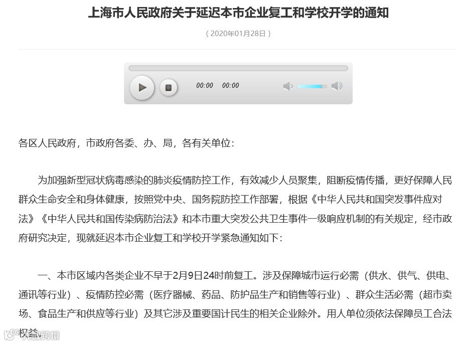 上海也推迟复工时间至2月9日24时。
