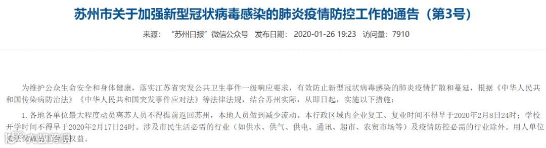 苏州率先发布通知延迟复工到2月8日24时。