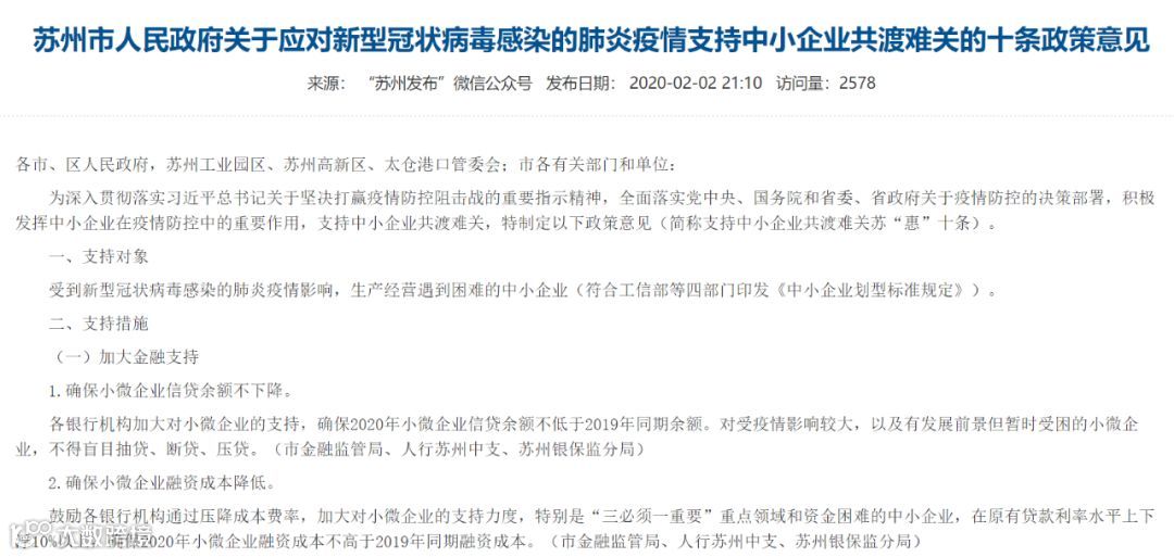 2月2日晚间,苏州市出台十条政策支持中小企业共渡难关:将对受到新型冠状病毒感染的肺炎疫情影响,生产经营遇到困难的中小企业提供加大金融支持、稳定职工队伍、减轻企业负担三大类支持措施。