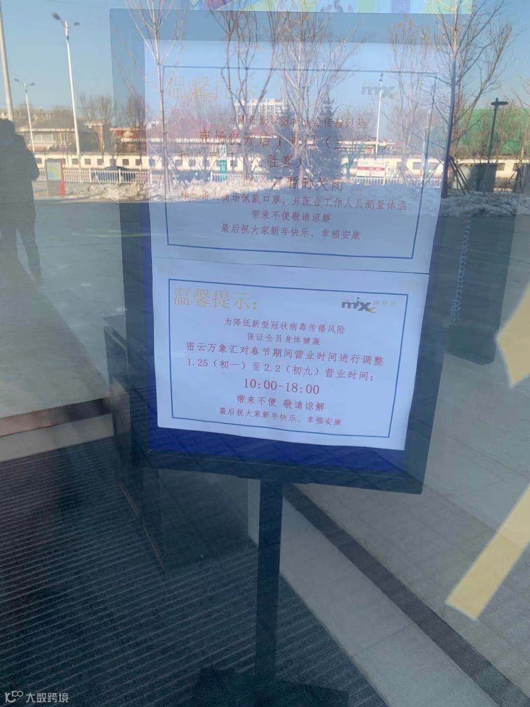 为了防控疫情,商场已经将每日营业时间调整至10:00-18:00,春节期间仅开放两扇门出入。