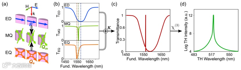 线性透射率数值计算结果如图2b所示。该图揭示了具有多个Mie共振模式,当它们在参数空间内靠近时会相互影响。图2d显示了在y=0时共振的电场振幅图 |E(ω)|。图中的四个区域分别为磁偶极子(MD)、电偶极子(ED)、磁四极子(MQ)和电四极子(EQ)模式。其中磁四极子模式(蓝色)与几乎平行的电偶极模式(绿色)相互作用,形成经典的不对称Fano共振特征,由MQ/Fano标签表示。MQ/Fano共振与电四极子模式(品红)共振紧密联系,在该点获得了最尖锐的Fano共振特征和最强的THG发射,在图2b中标记为Super-Fano共振点。