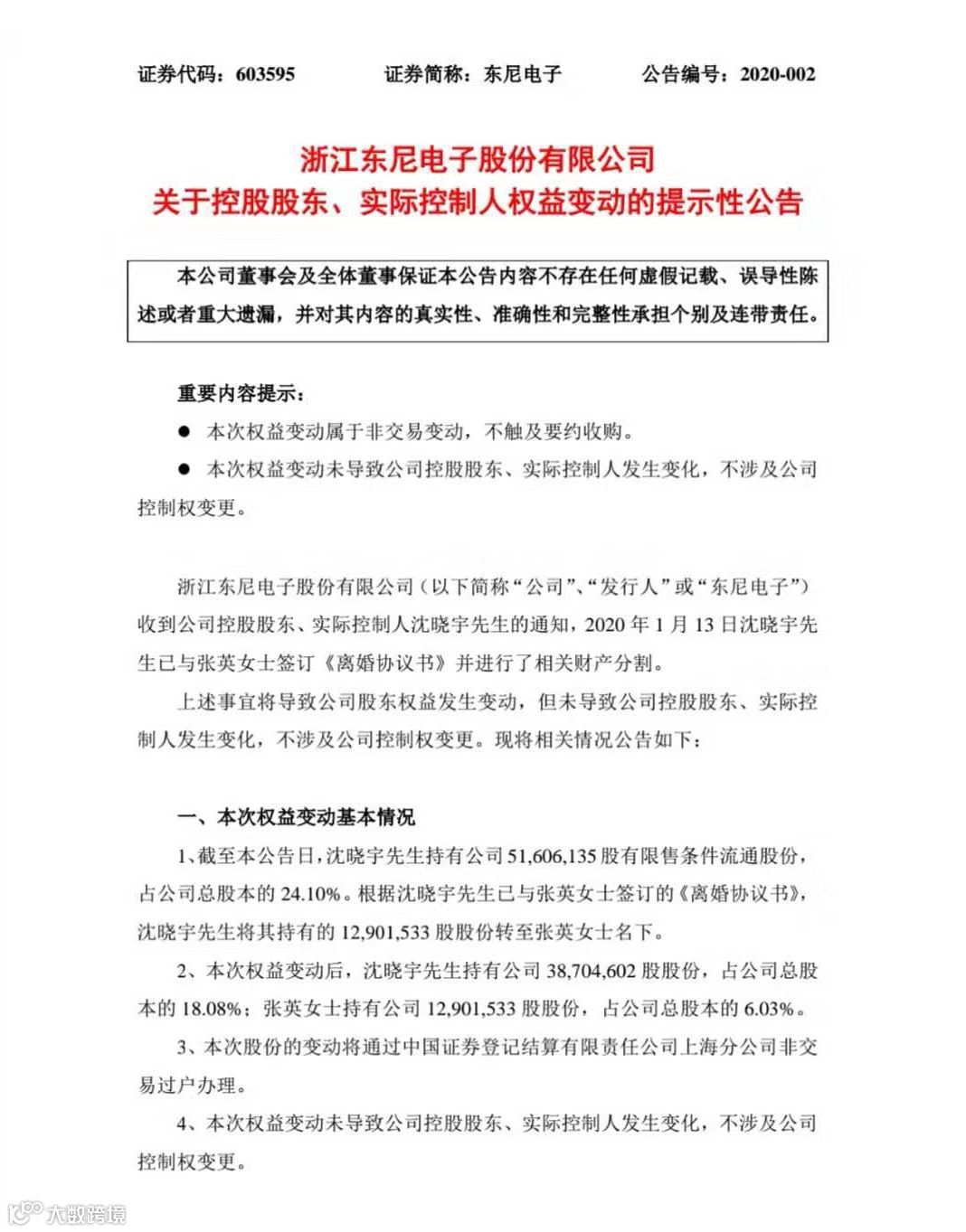 根据上述公告,东尼电子控股股东、实际控制人沈晓宇已与张英签订《离婚协议书》并进行了相关财产分割。