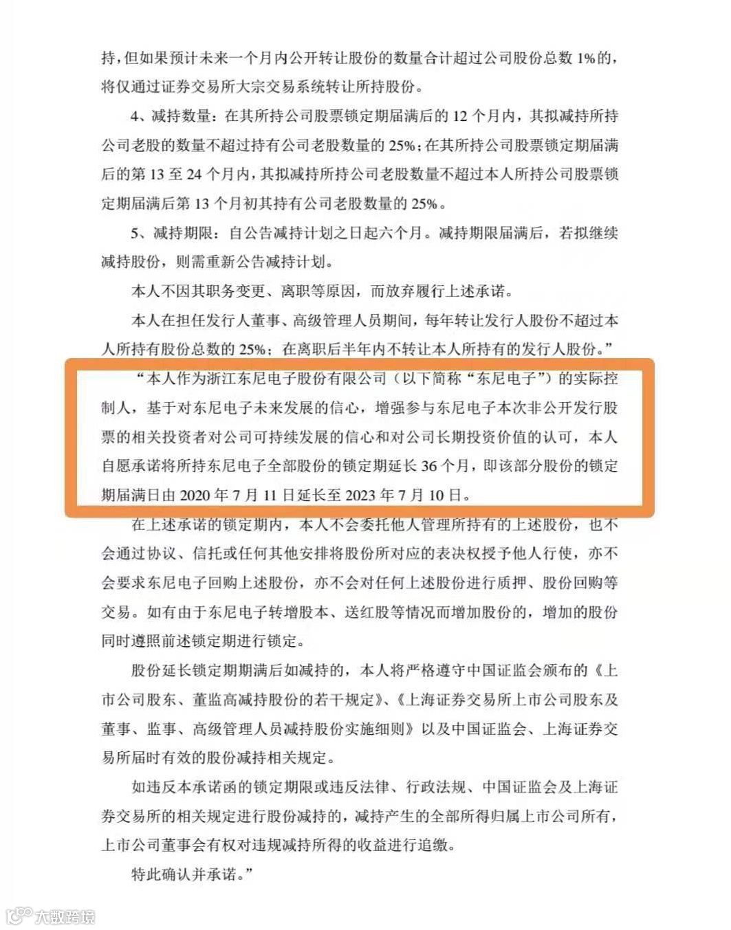 《自愿延长股份锁定期的承诺函》中,沈晓宇承诺,将所持东尼电子全部股份的锁定期延长36个月,即该部分股份的锁定期届满日由2020年7月11日延长至2023年7月10日。