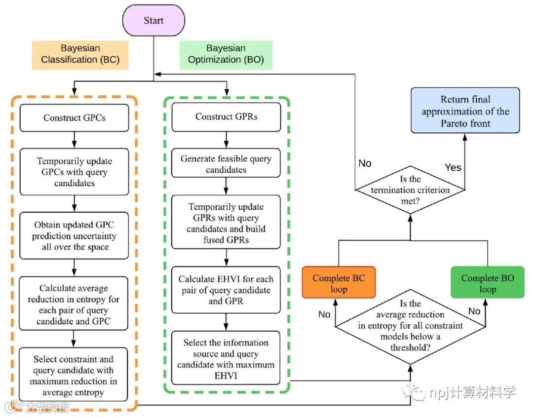 多目标贝叶斯优化方法使用最少的数据,使用基于启发式的搜索来寻找信息最丰富的观察结果,并增加系统在优化设计方面的知识状态,已成功应用于材料科学的各种领域中。对必须通过积极学习约束来确定可行的设计空间时,研究者提出利用机器学习方法学习约束设计空间,主要关注可行空间的边界,并使用分类器来表示设计空间中的可行和不可行区域的可行性边界。为了有效地利用分类器来表示约束边界,需要学习可行性边界,以保证分类器预测的准确性。