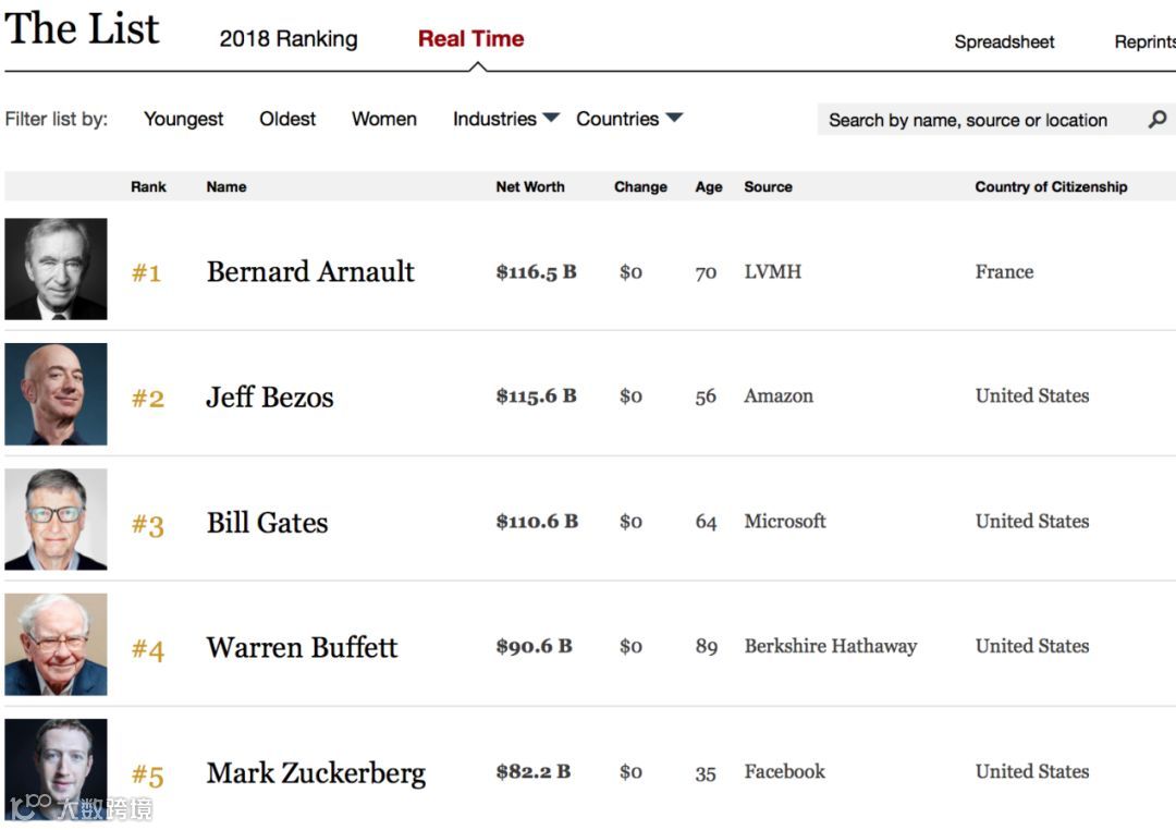 目前福布斯富豪榜前三名的财富净值均在1100亿美元左右,且相差并不算特别悬殊,所以这个榜单的前三名位置并不稳定。