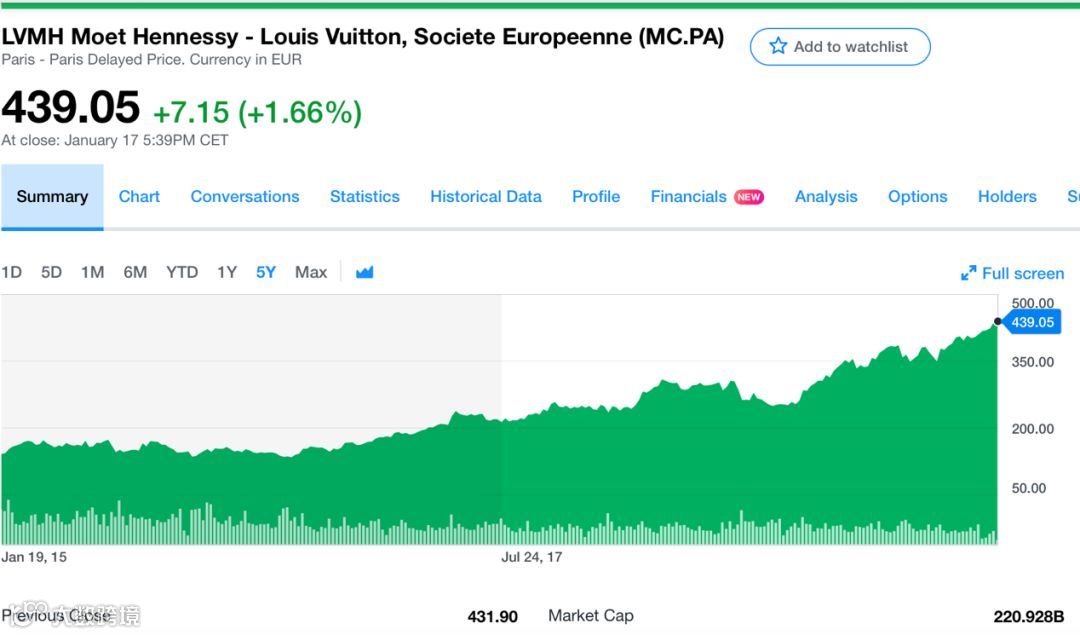 2020年开年,LVMH股价的持续强势攻势。目前,LVMH股价为439.05欧元,创历史新高,对应的总市值为2209亿欧元(约合1.68万亿元人民币)。阿尔诺迅速跻身世界首富宝座,很大程度上便是这个“历史新高”的功劳。