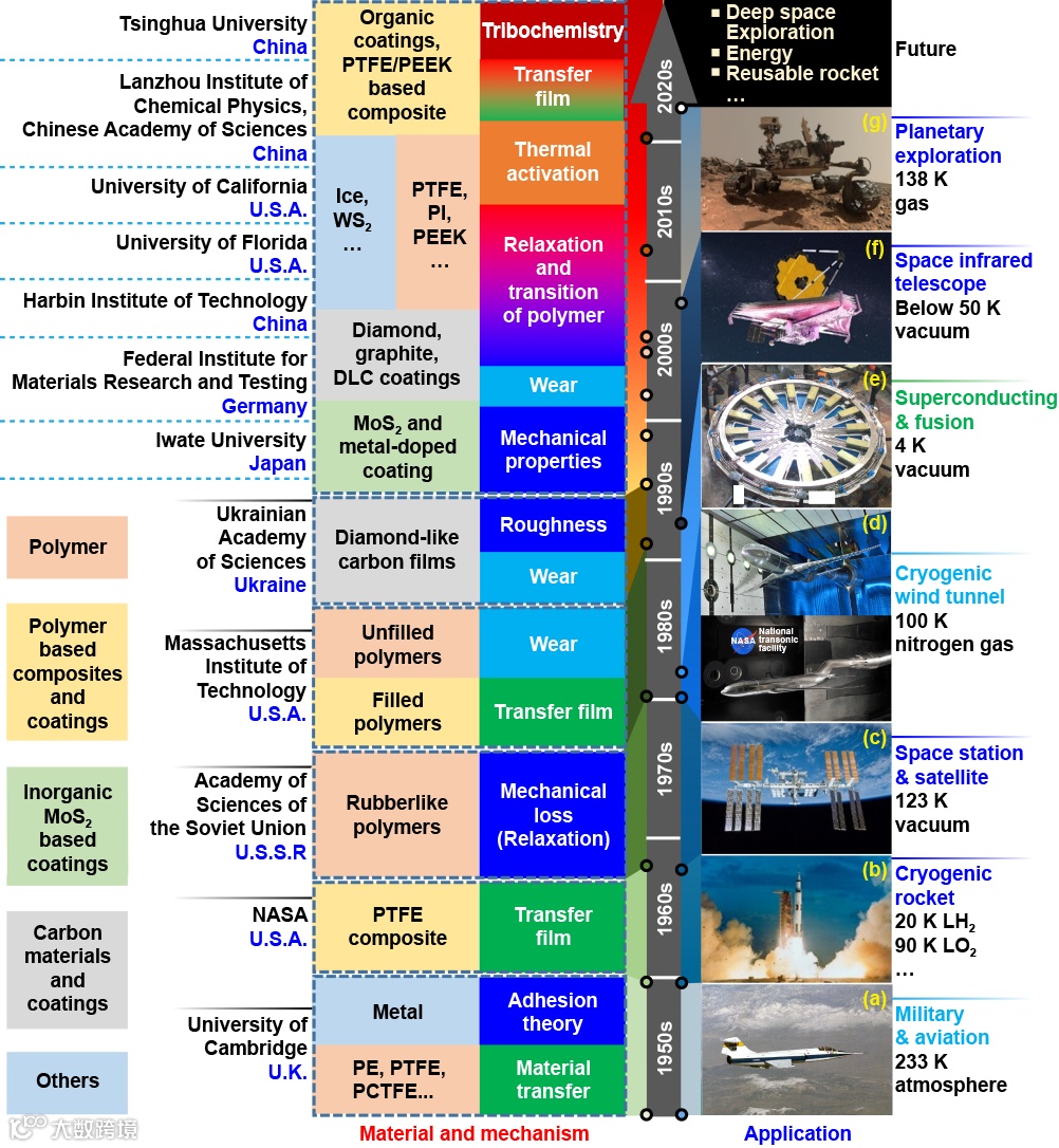 随着航天、航空、军事、超导等尖端技术领域的发展,许多高端装备提出在低温甚至超低温环境中运行工作的需求,然而当温度较低时,传统润滑油、润滑脂的粘度增大甚至固化会导致轴承等关键运动副部件润滑失效,固体润滑材料成为实现运动副润滑的唯一选择。而目前固体润滑材料低温摩擦磨损理论存在较大争议,亟需对现有文献进行整理、归纳,进而为后续研究提供有价值的参考。此外,探索新的低温摩擦实验测试方法与手段是推动低温摩擦学研究的关键。另一方面,轴承等零部件级的低温摩擦磨损理论研究仍很欠缺,而且随着低温润滑要求的提高,如何进一步改善固体润滑材料及部件低温摩擦学性能是一个亟需解决的问题。近期,清华大学机械工程系、高端装备界面科学与技术全国重点实验室的马天宝教授、崔文岩博士、陈宏展博士生、赵建勋博士生、马全胜博士生、徐强博士在SCI核心期刊《极端制造》(International Journal of Extreme Manufacturing, IJEM)上共同发表《低温摩擦学研究进展:摩擦机理、测试方法与应用》的综述,系统介绍了固体润滑材料低温摩擦学理论、实验测试技术的研究进展以及应用现状。图1展示了自20世纪50年代以来低温摩擦学的发展历程,在应用需求的牵引下,以及在温度如何影响摩擦磨损这一科学问题的驱使下,固体自润滑材料低温摩擦学理论与应用研究取得了一系列进展。